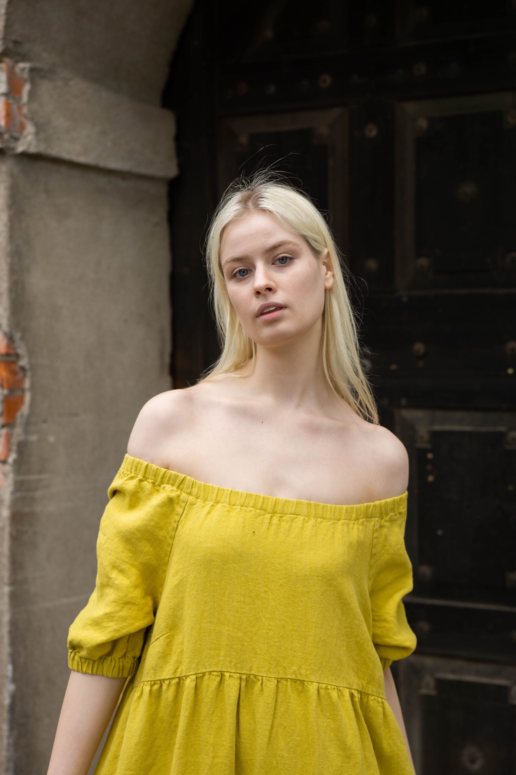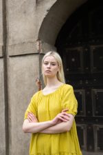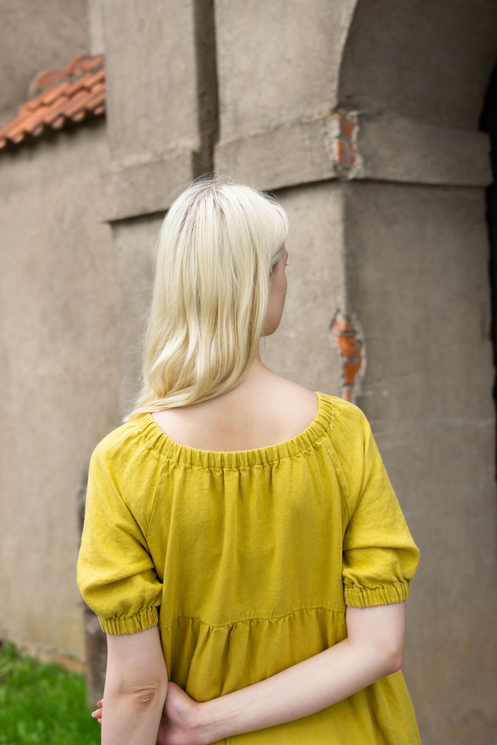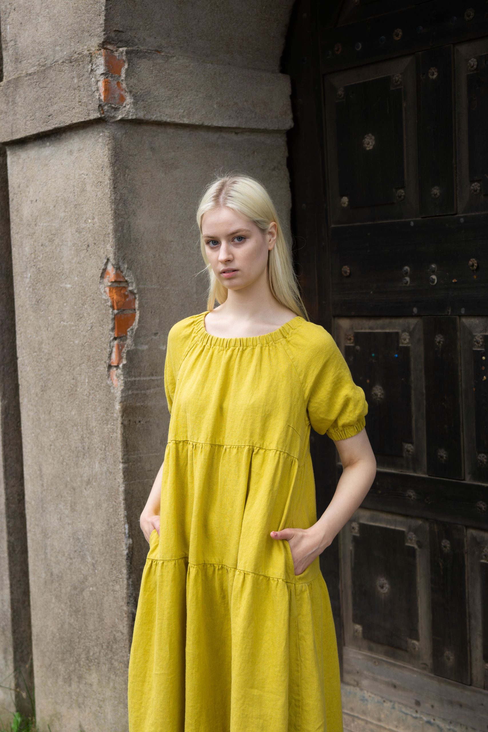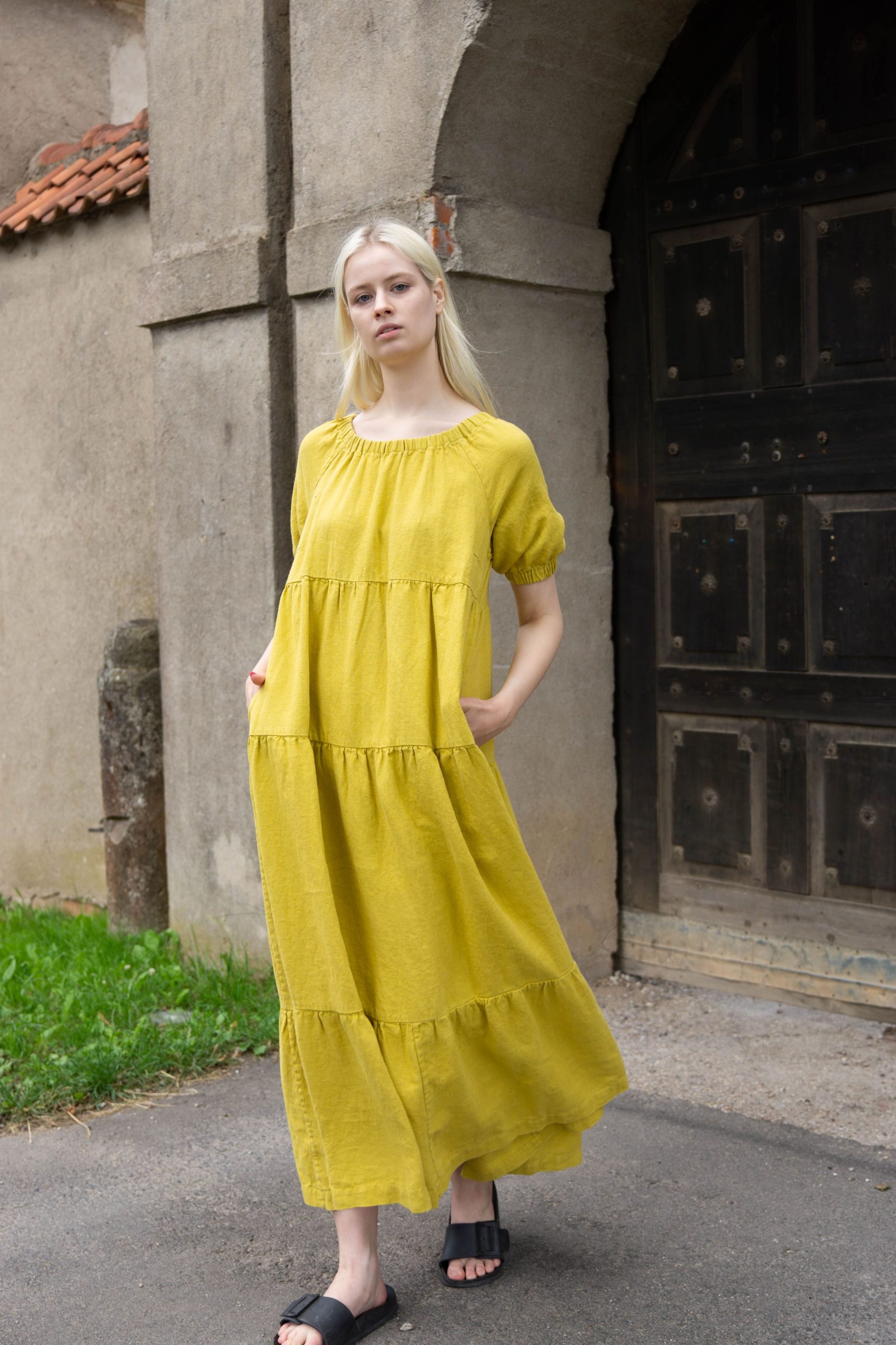 This dress made of mustard yellow linen blends classic style with effortless ease. Its loose silhouette, delicately pleated details, puffy sleeves, and tiered skirt convey a feeling of lightness and dignity. On hot days, the lightweight linen fabric guarantees comfort, and the useful side pockets enhance usefulness. This dress embodies natural style with a touch of country charm, whether you’re enjoying a cosy afternoon or strolling through the streets of a sunny city.