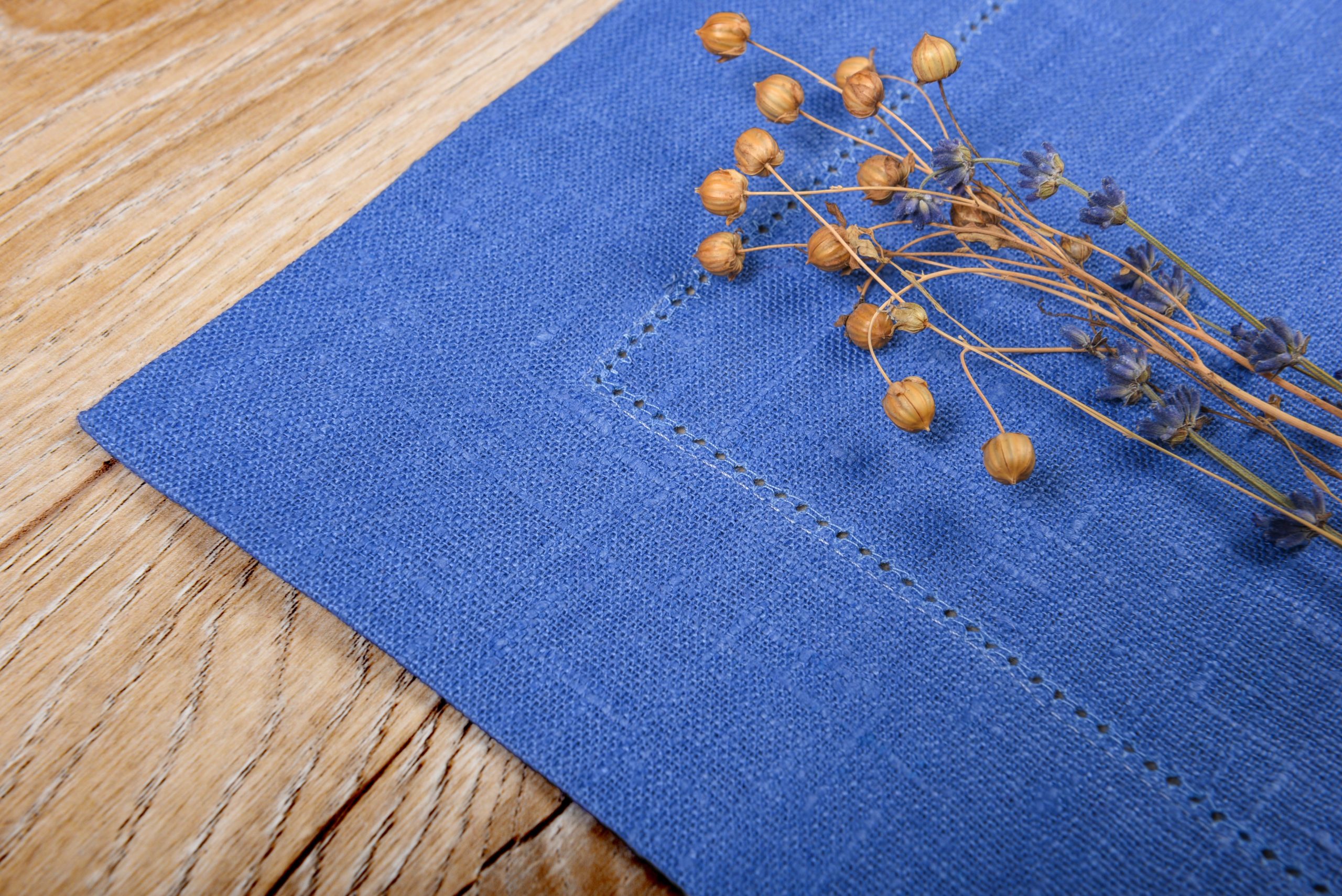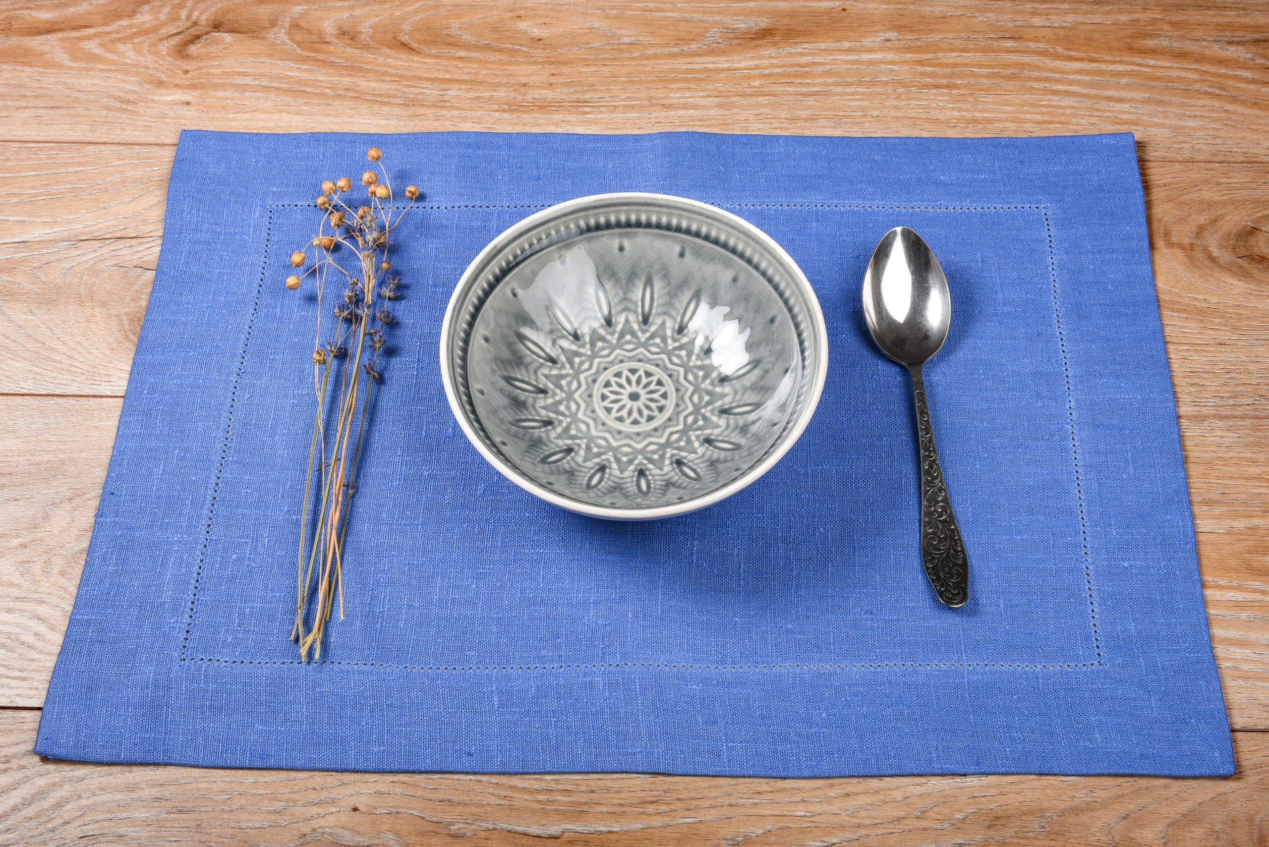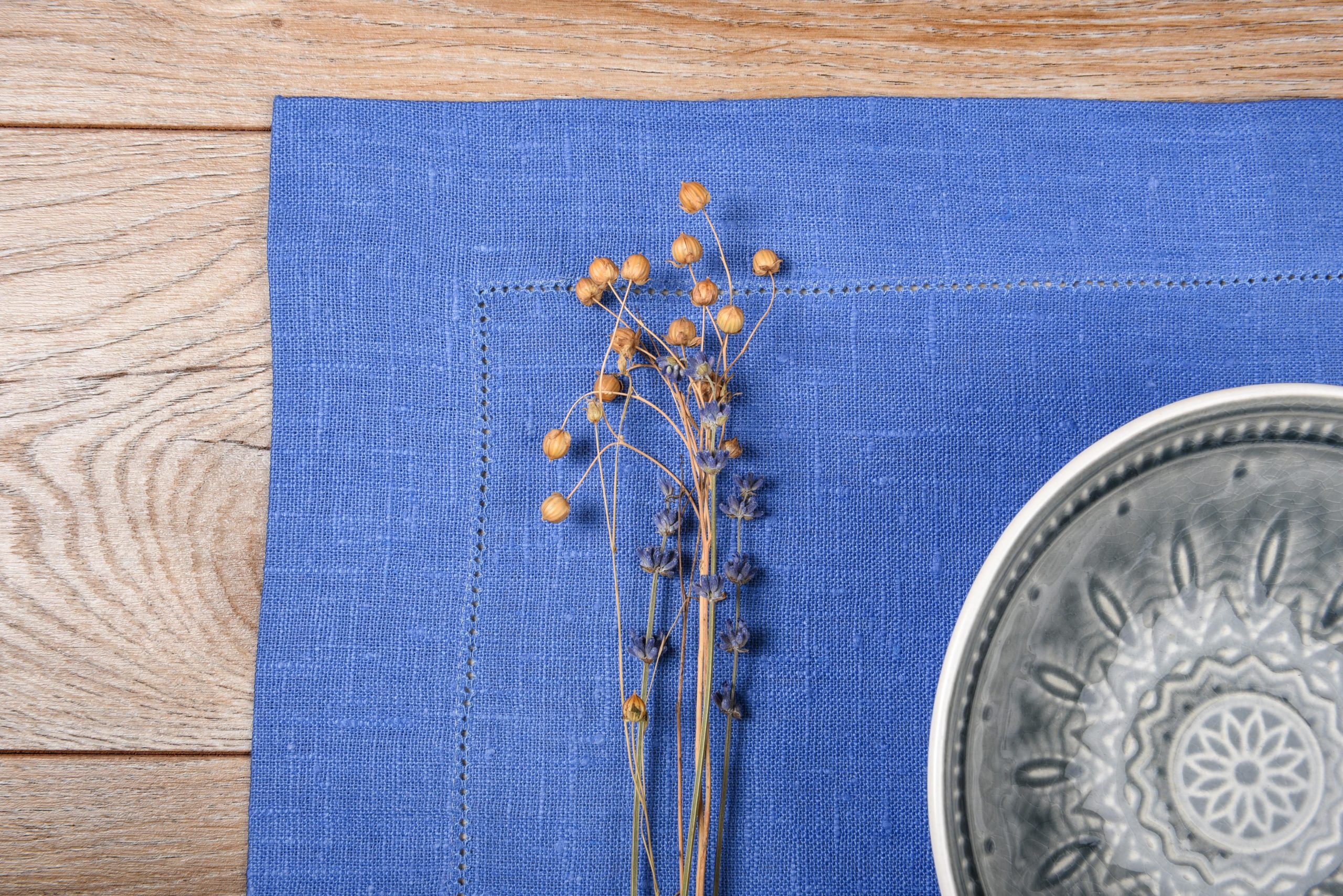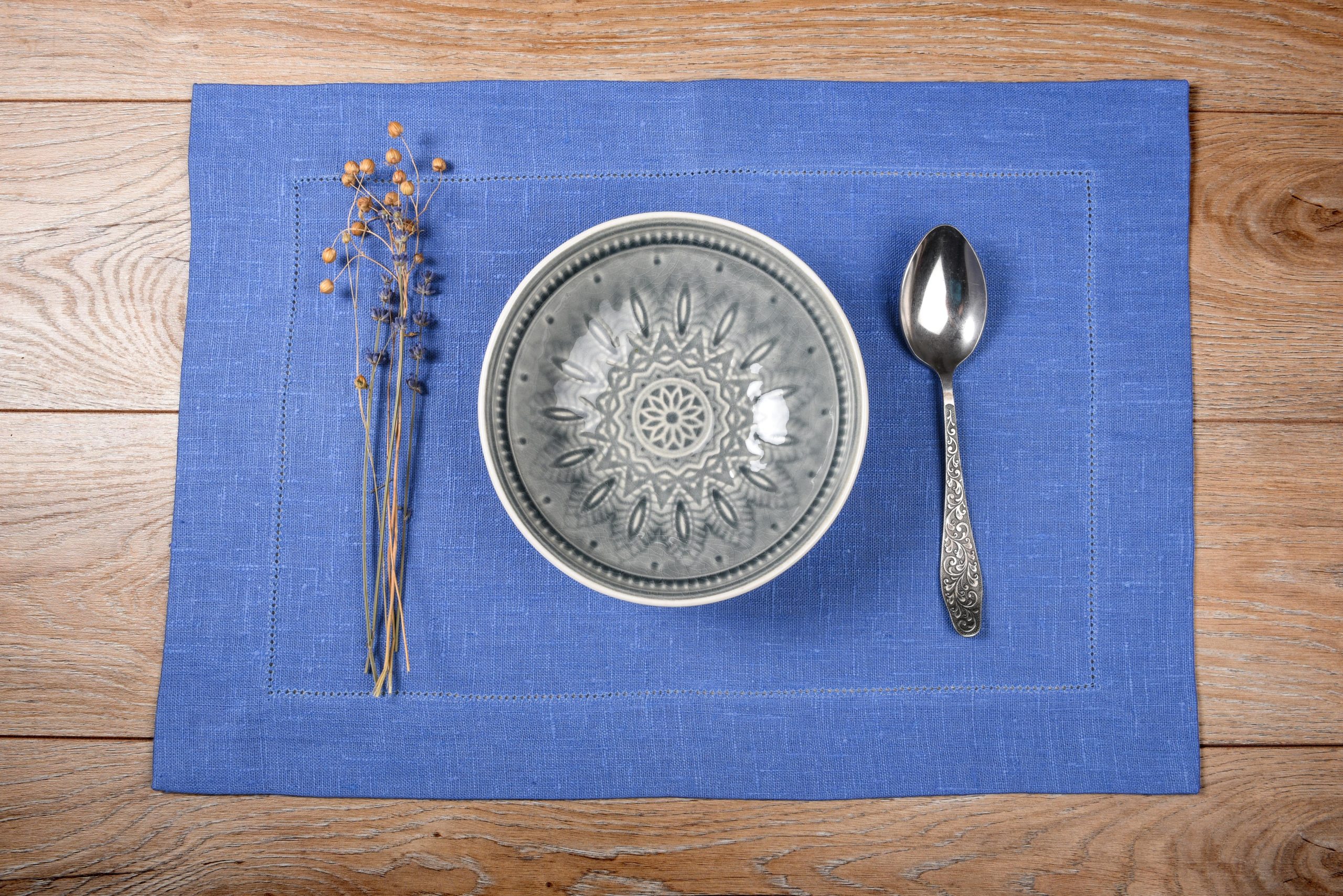 - Navy blue linen placemats made from 100% natural flax fibers.
