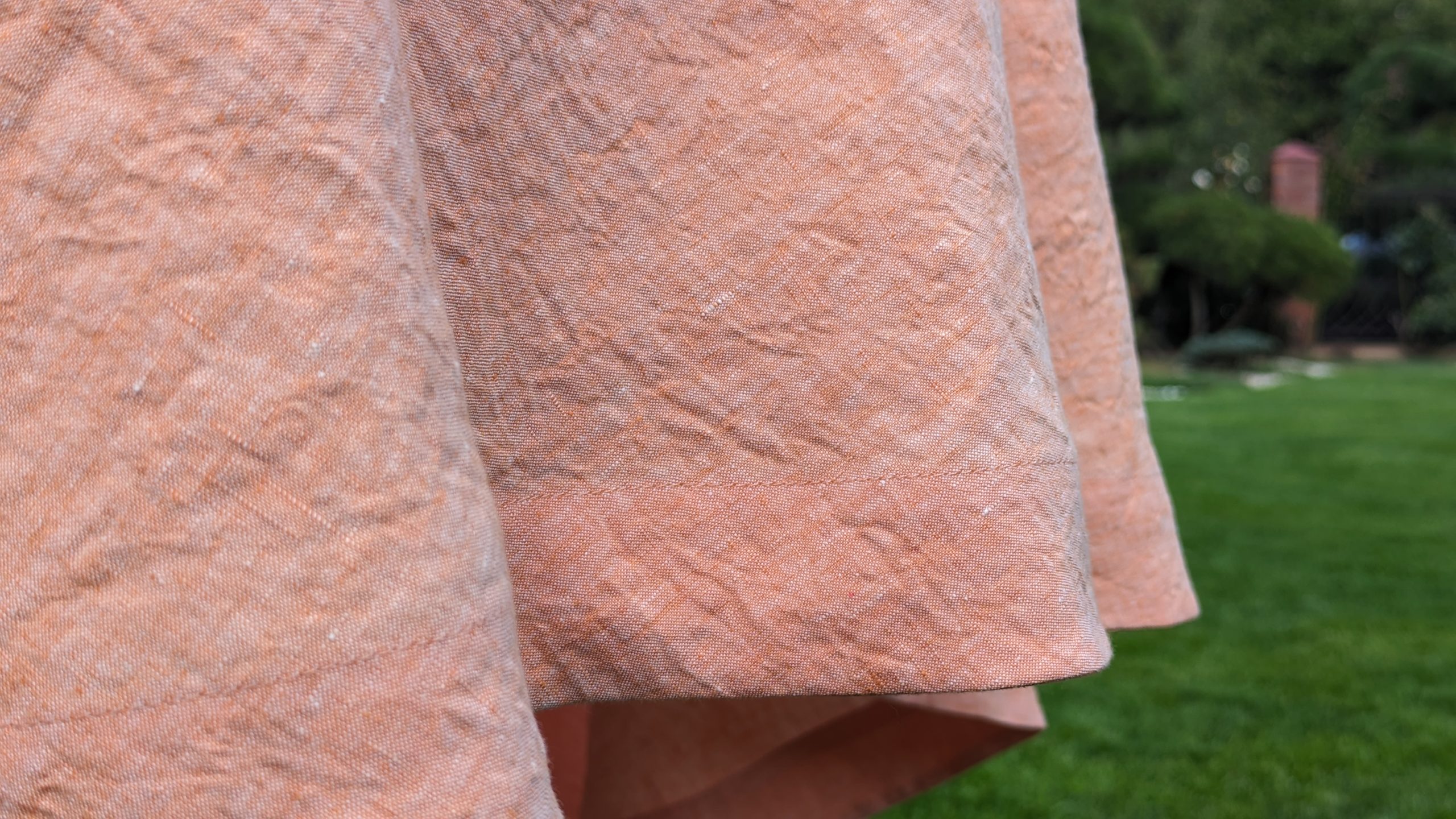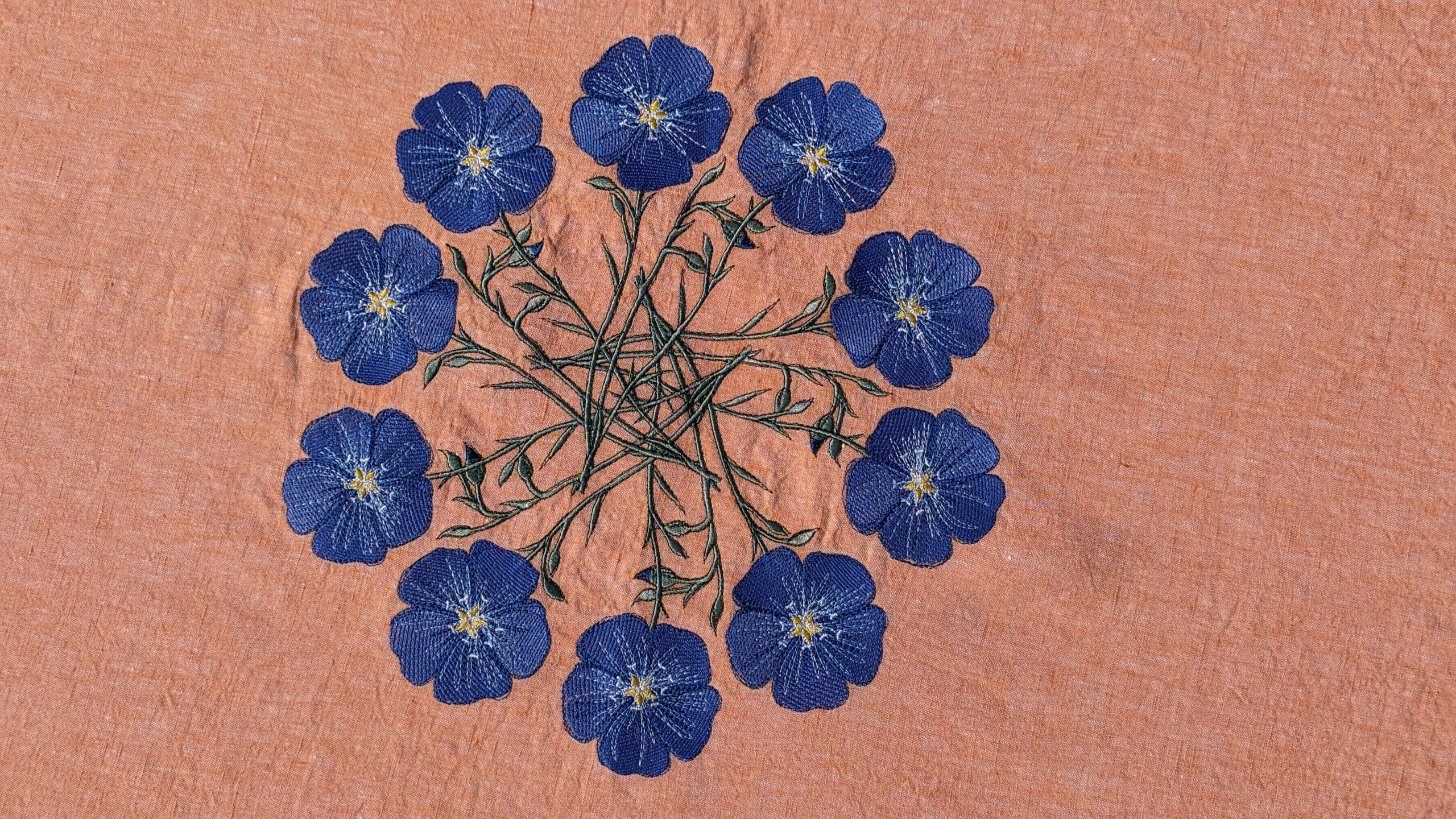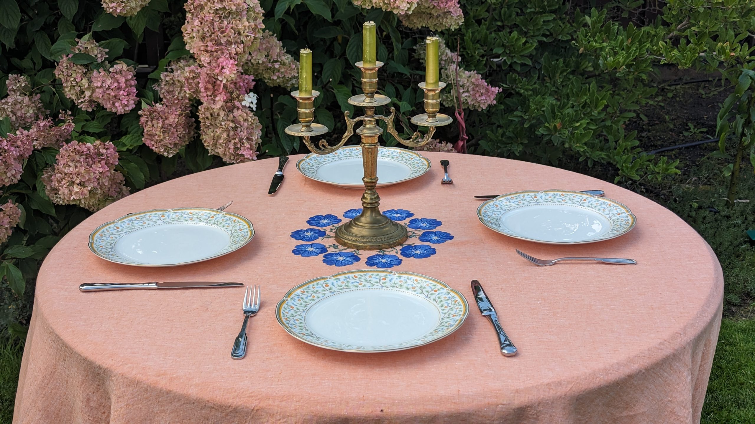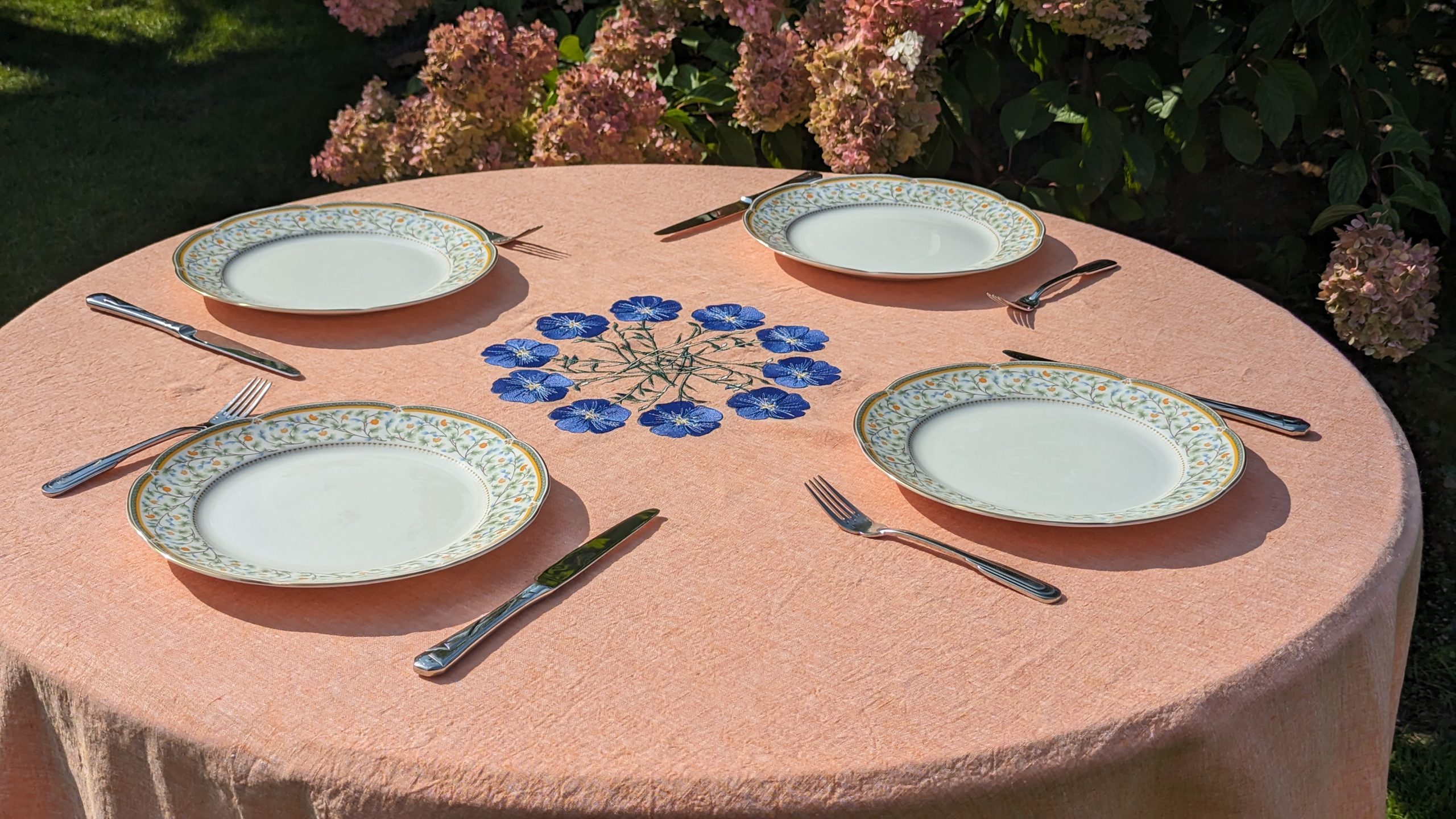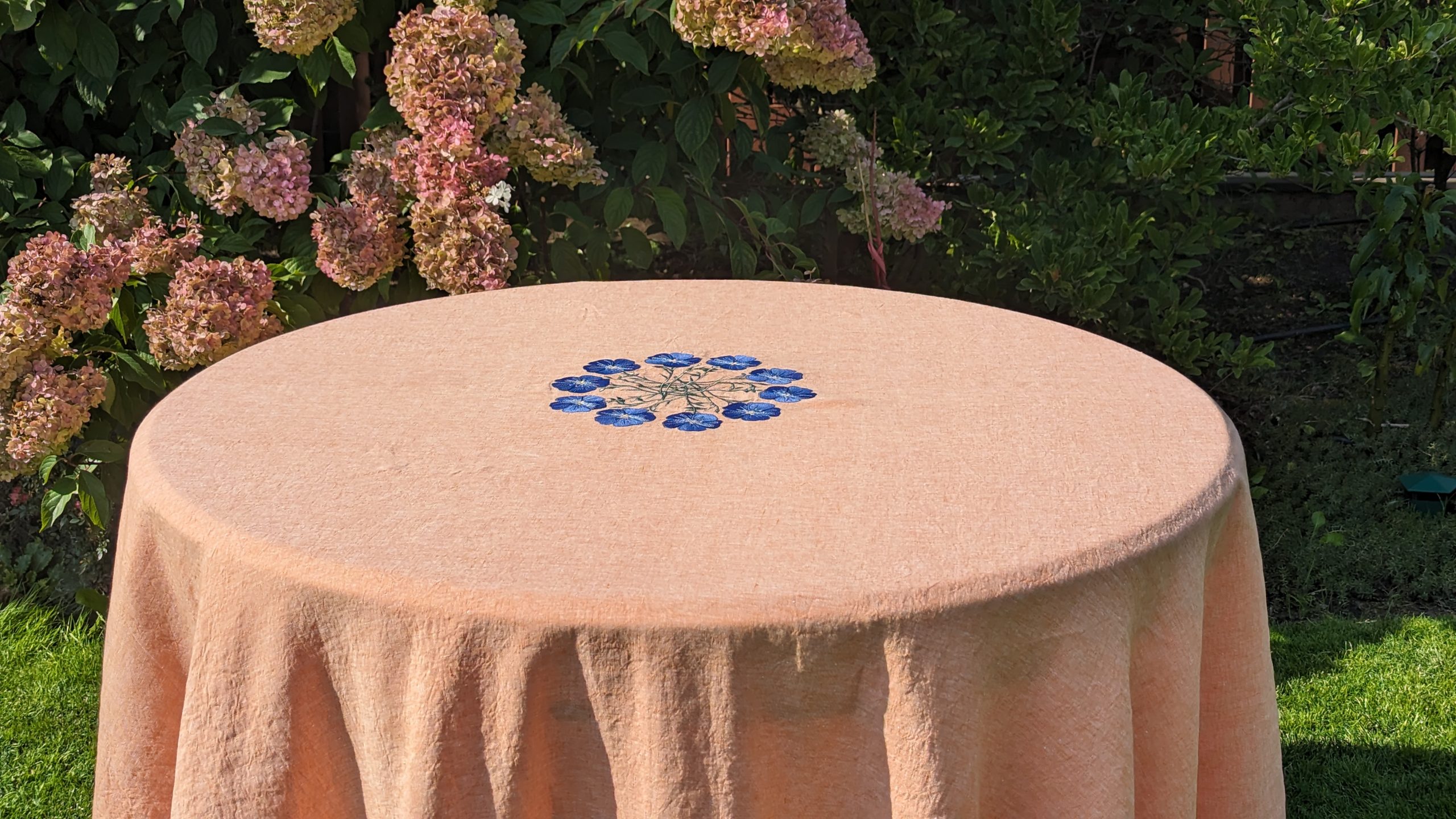 Pink Linen Melange Tablecloth with blue stitched flowers