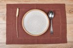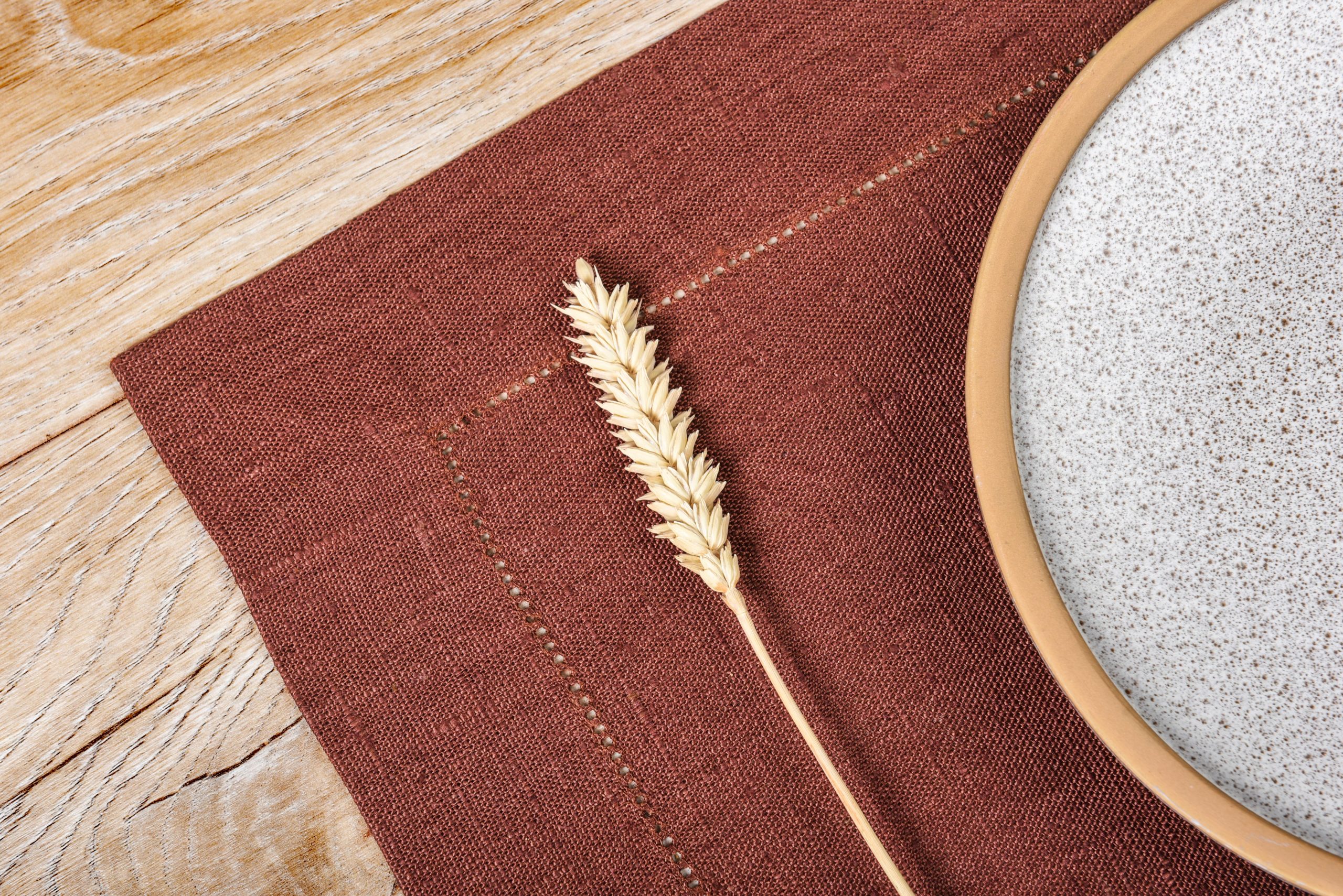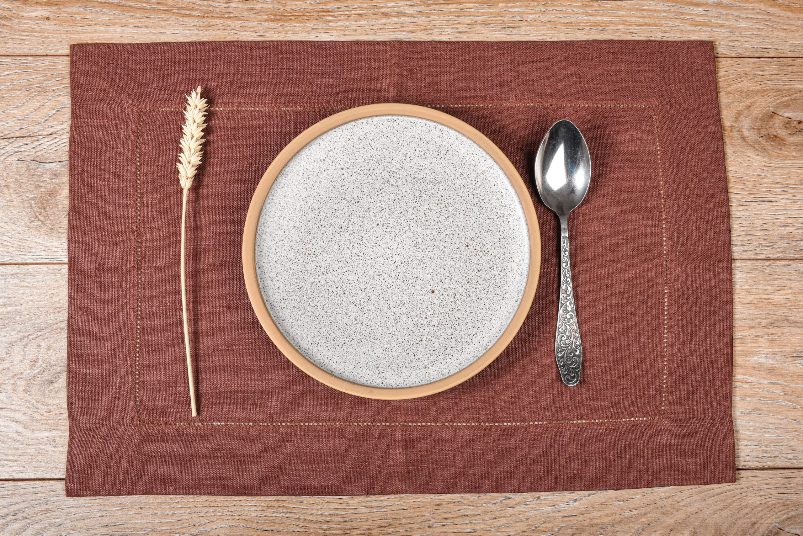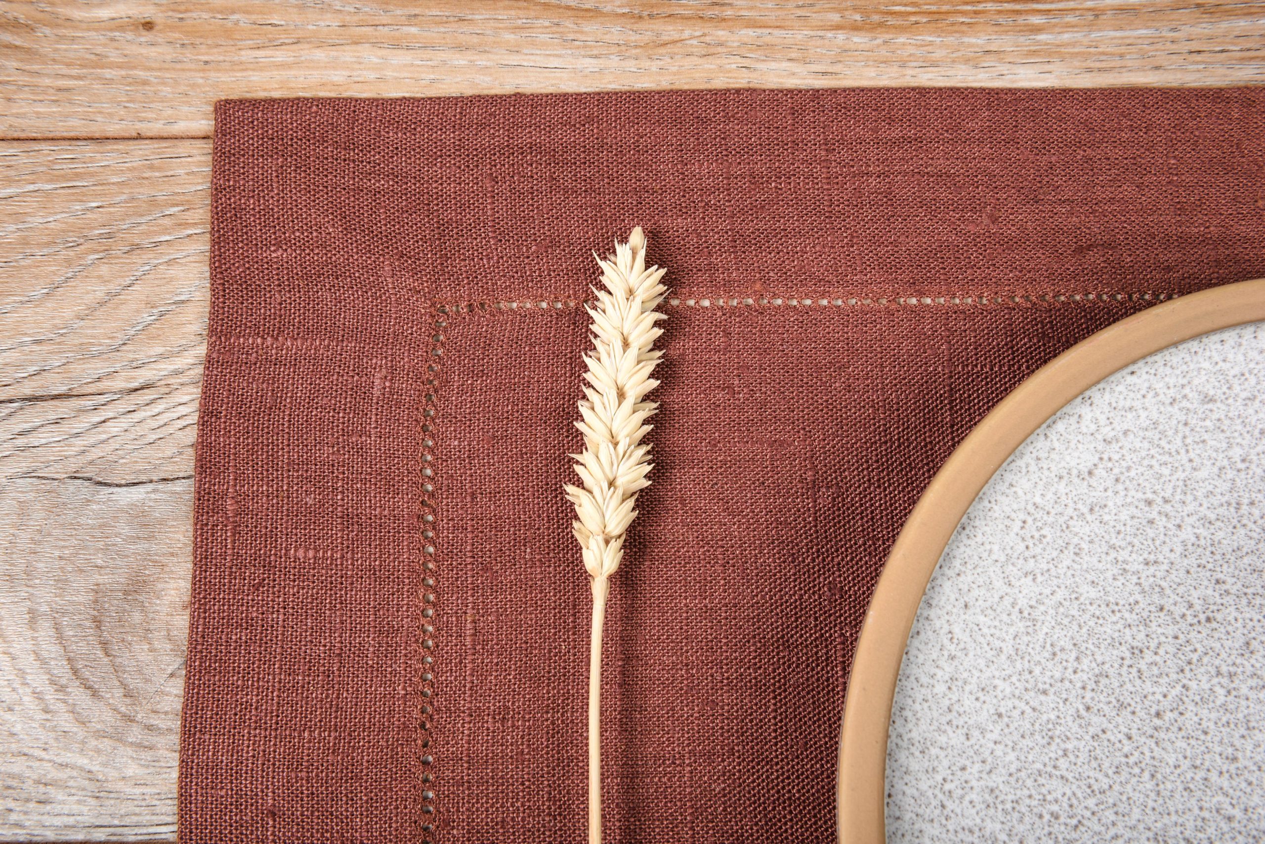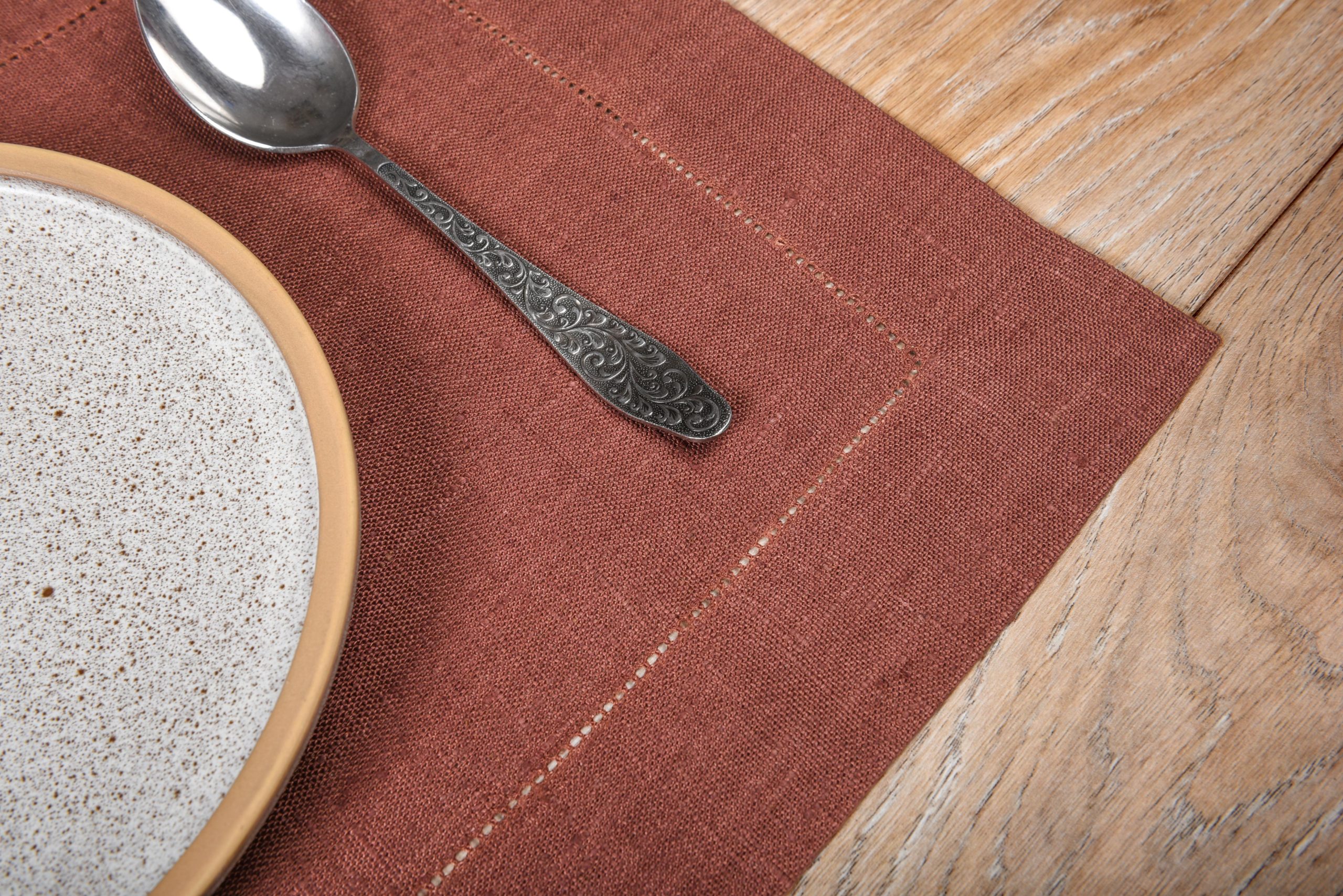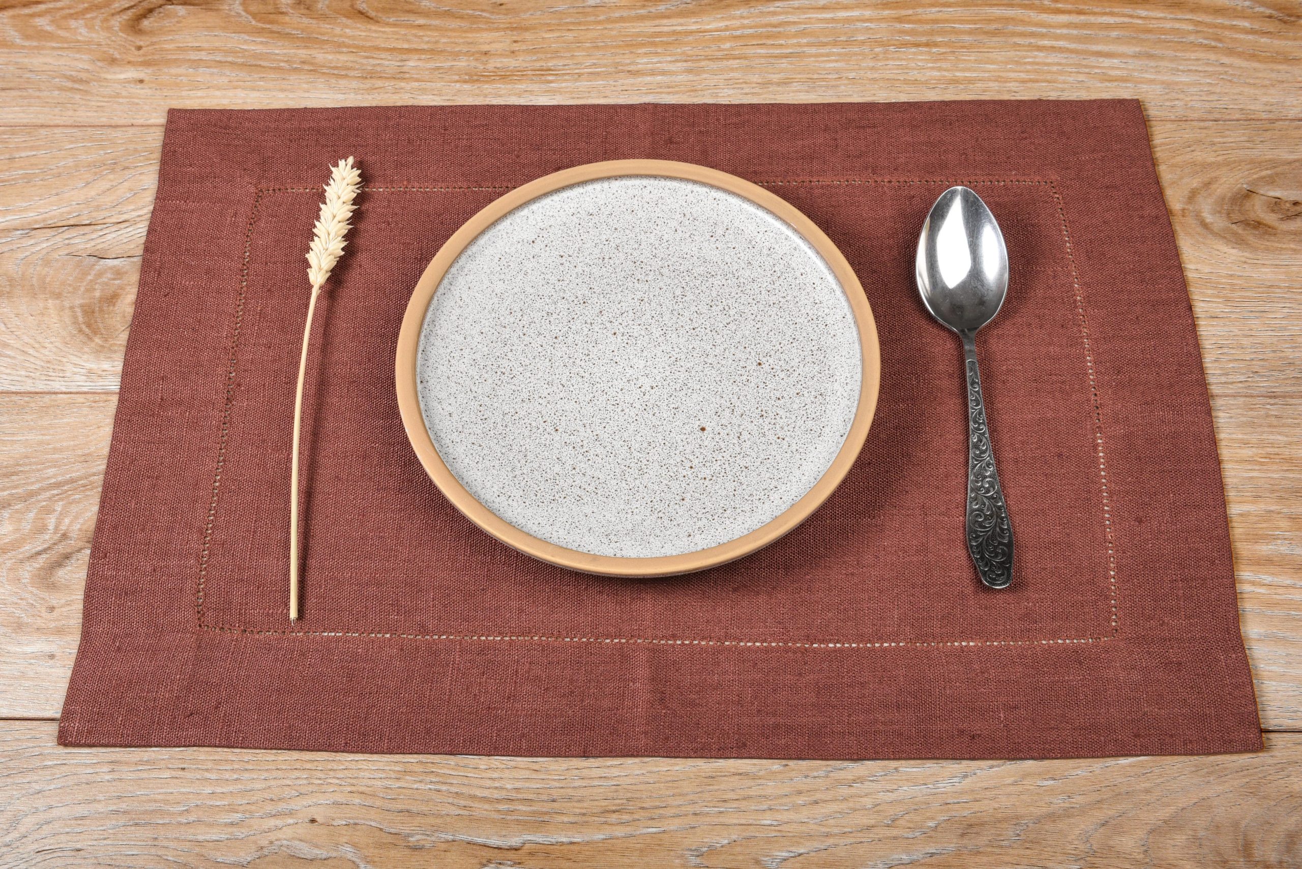 - Toffee brown linen placemats made from 100% natural flax fibers.