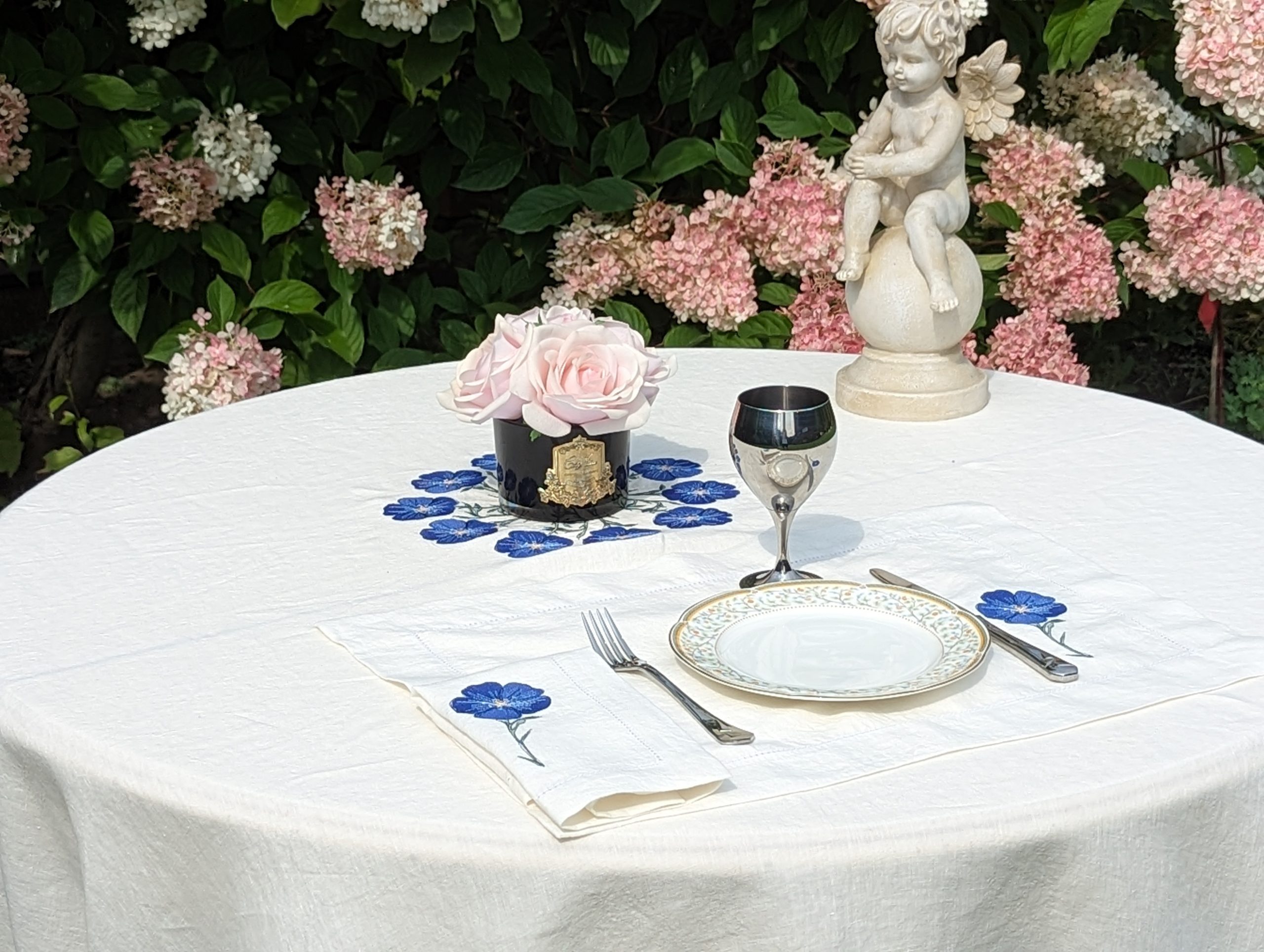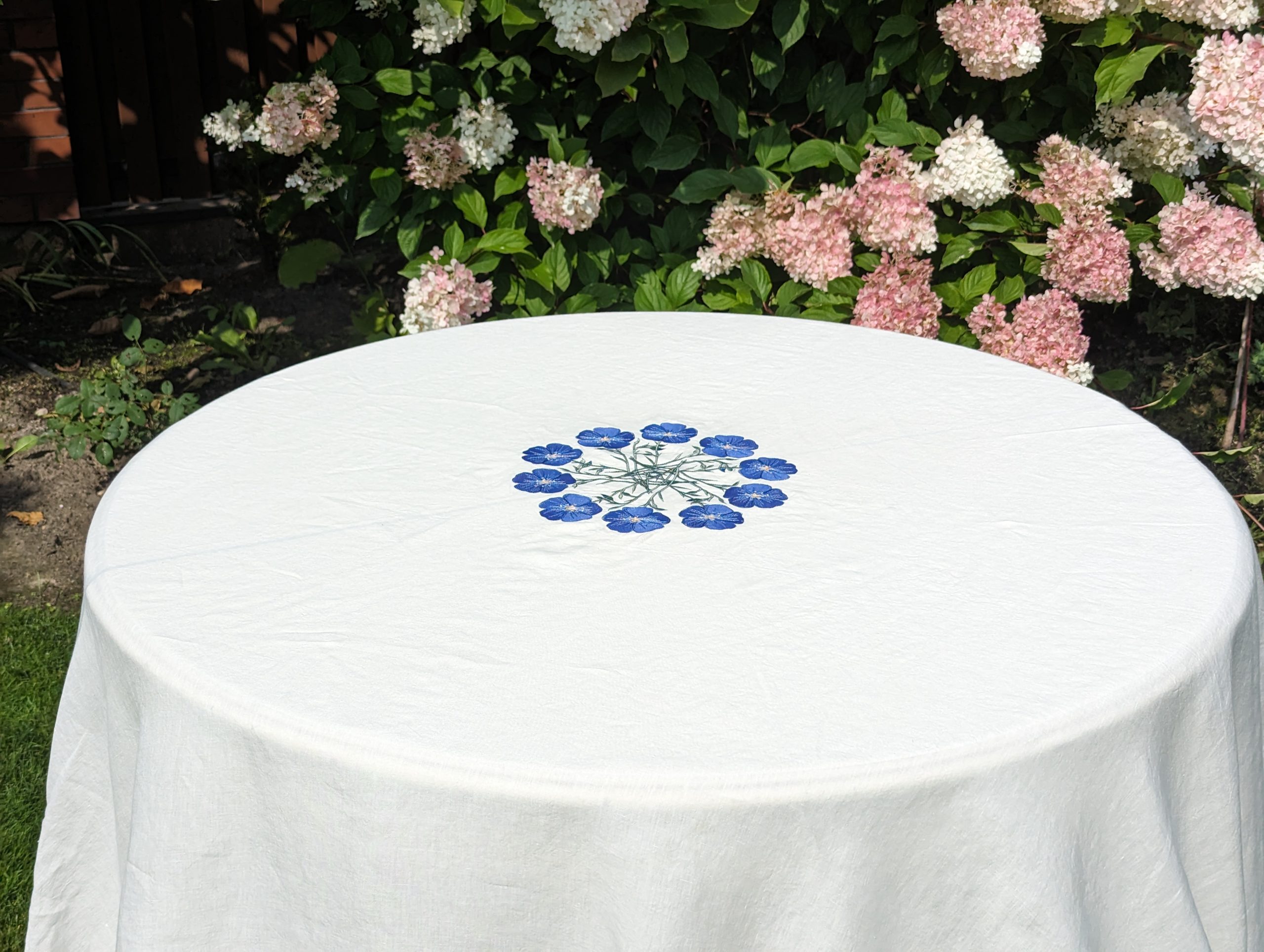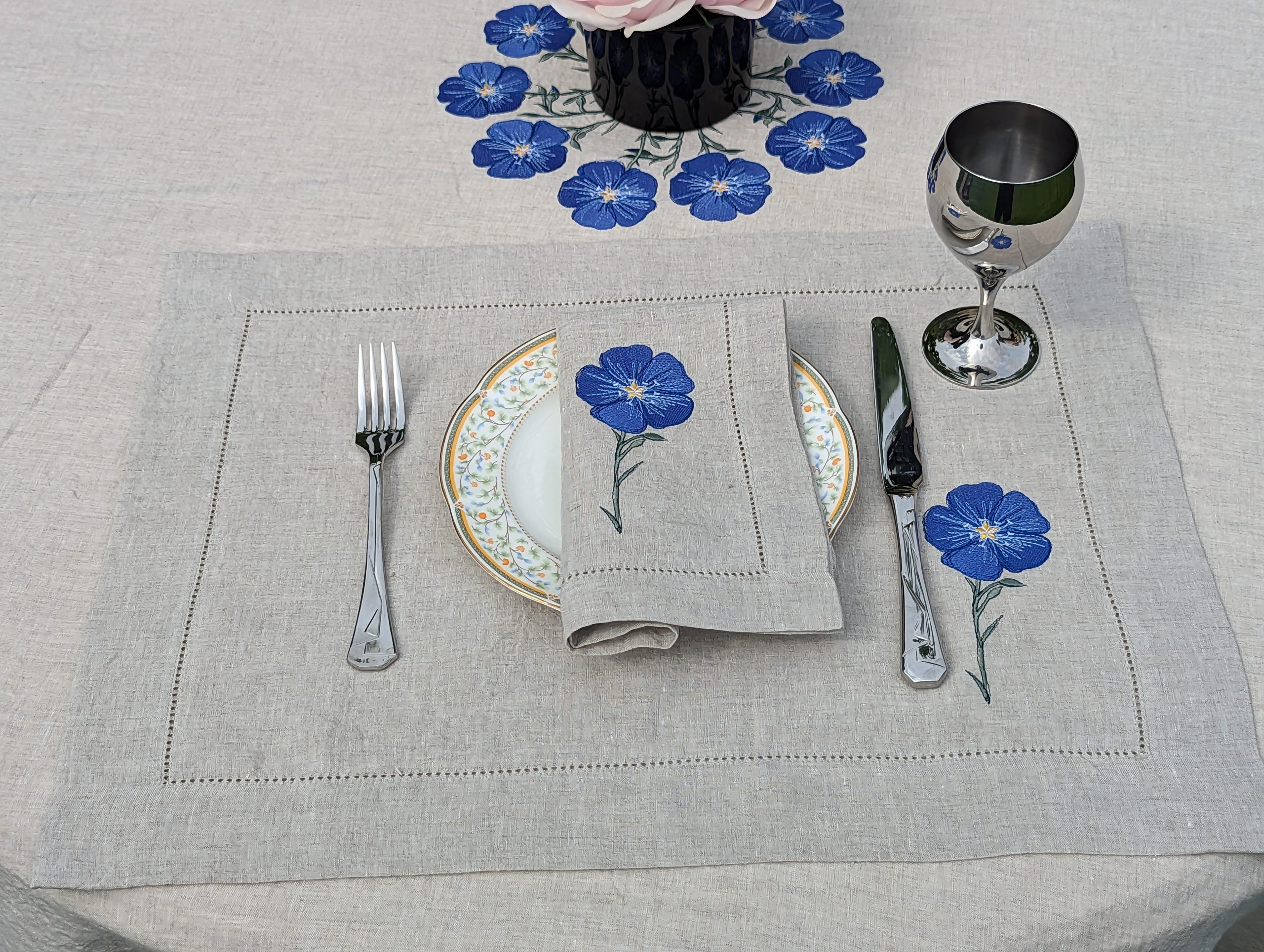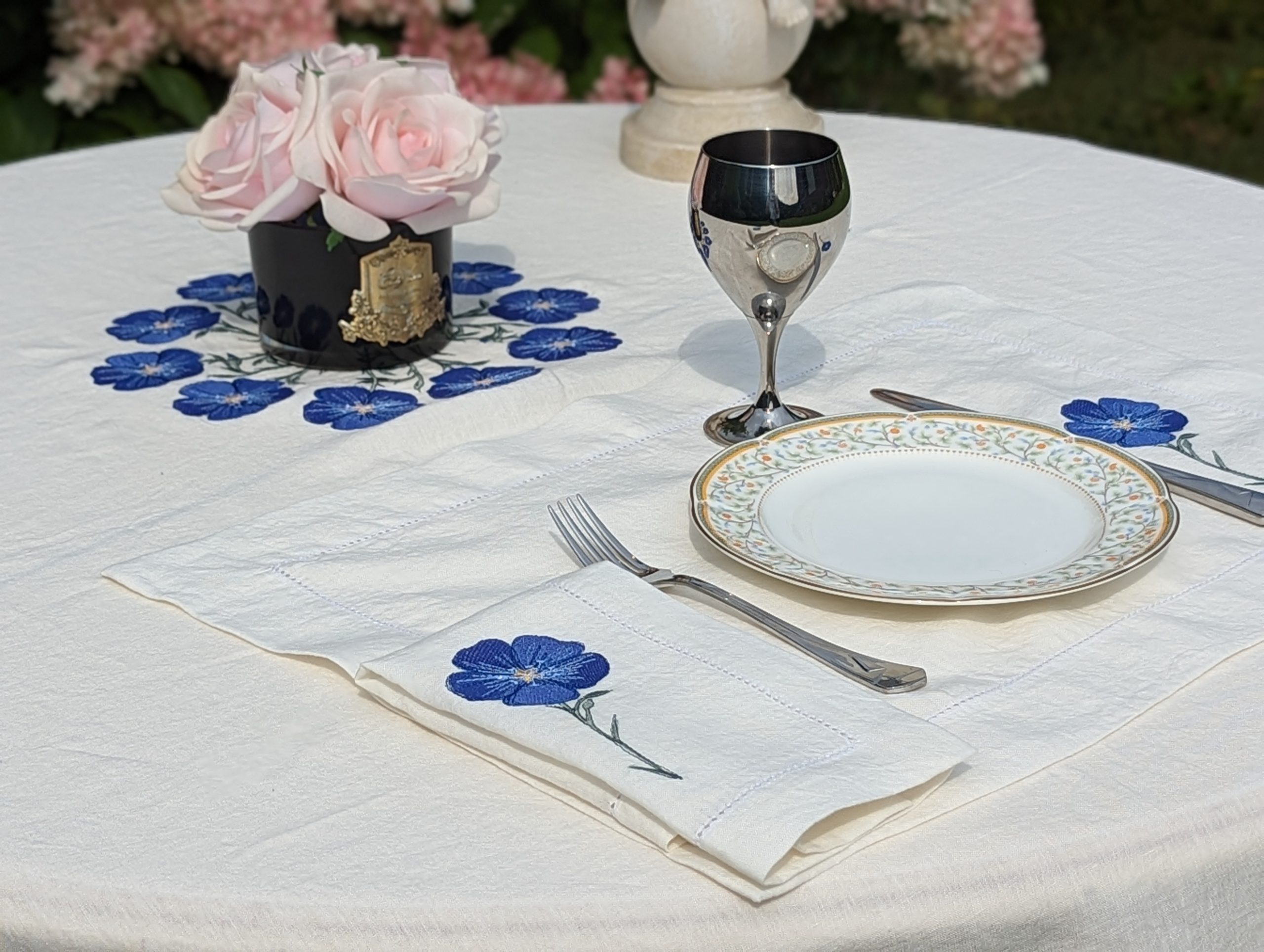 White Linen Melange Tablecloth with blue stitched flowers