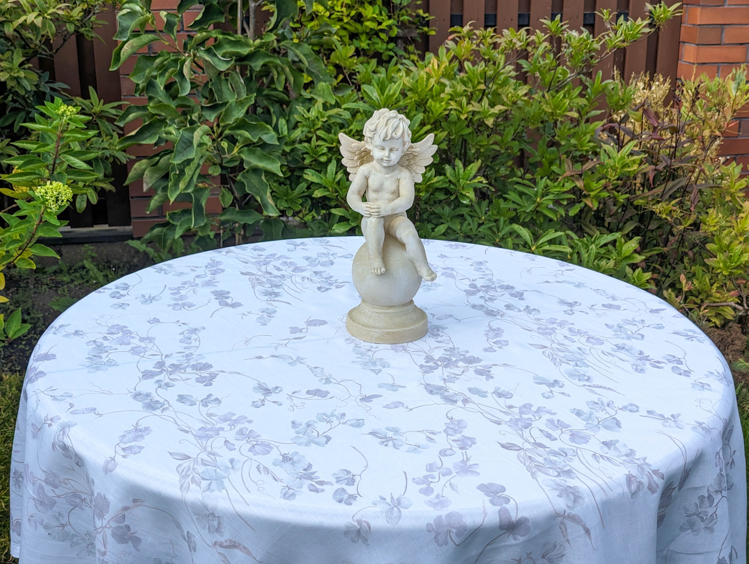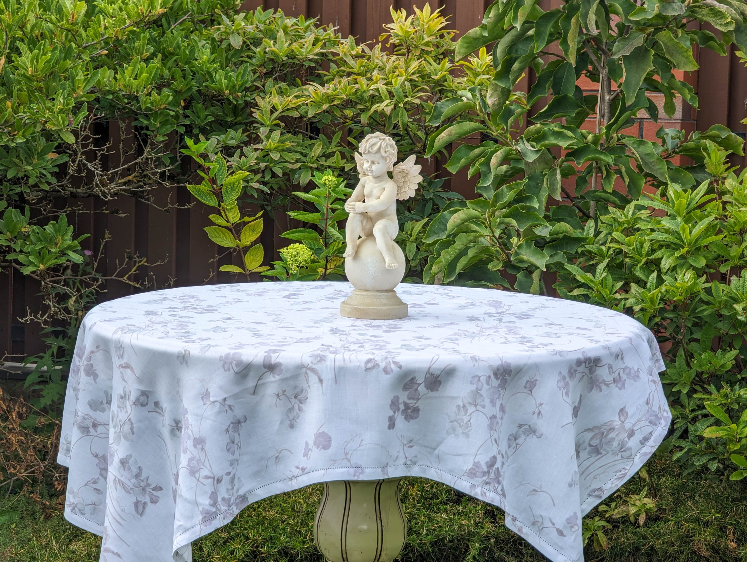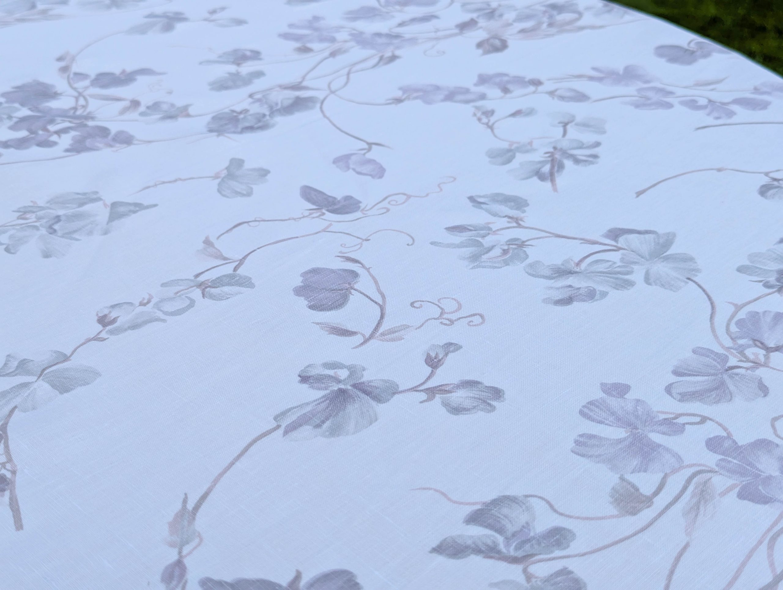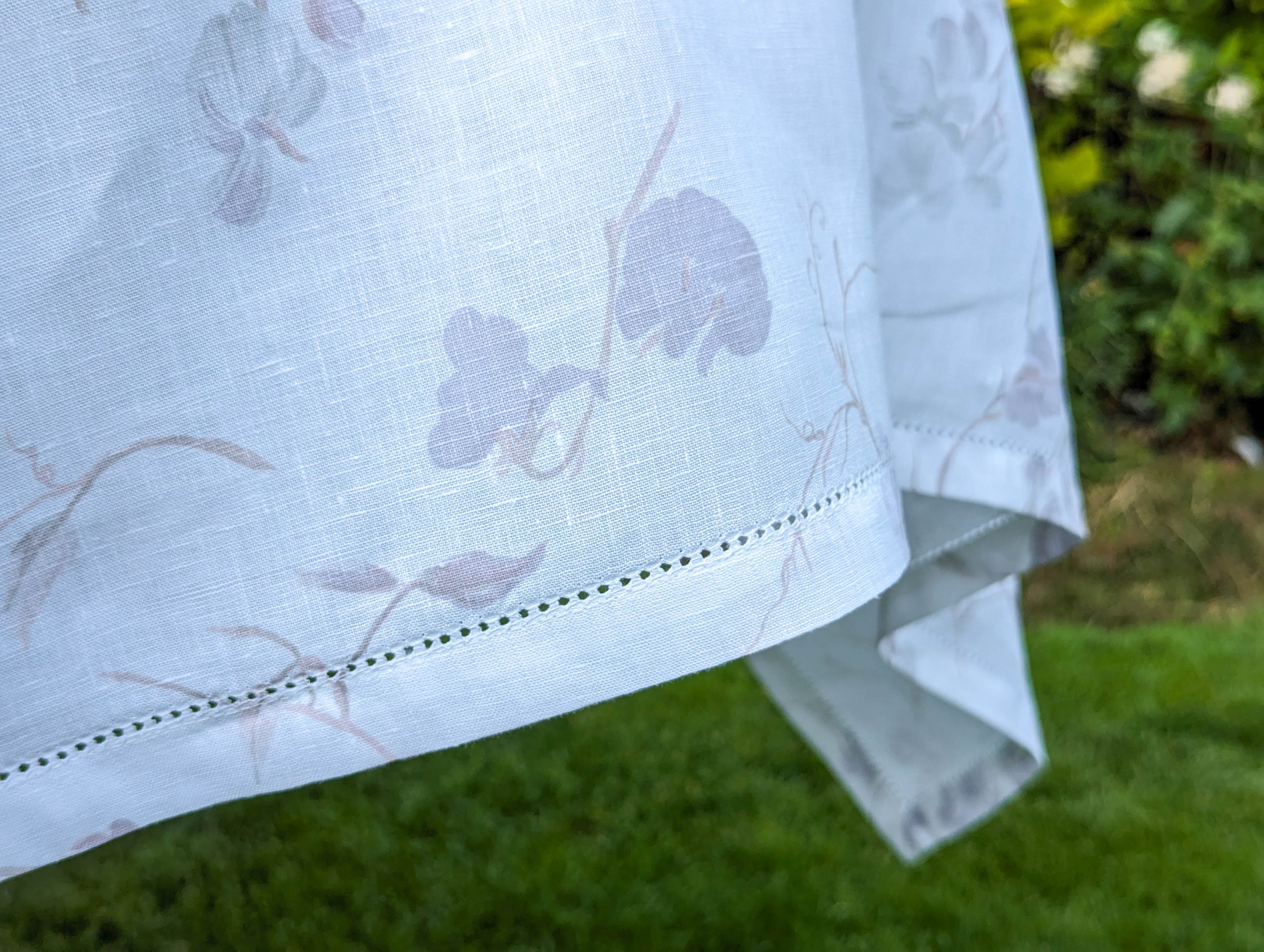 White Linen Tablecloth with small violet flowers