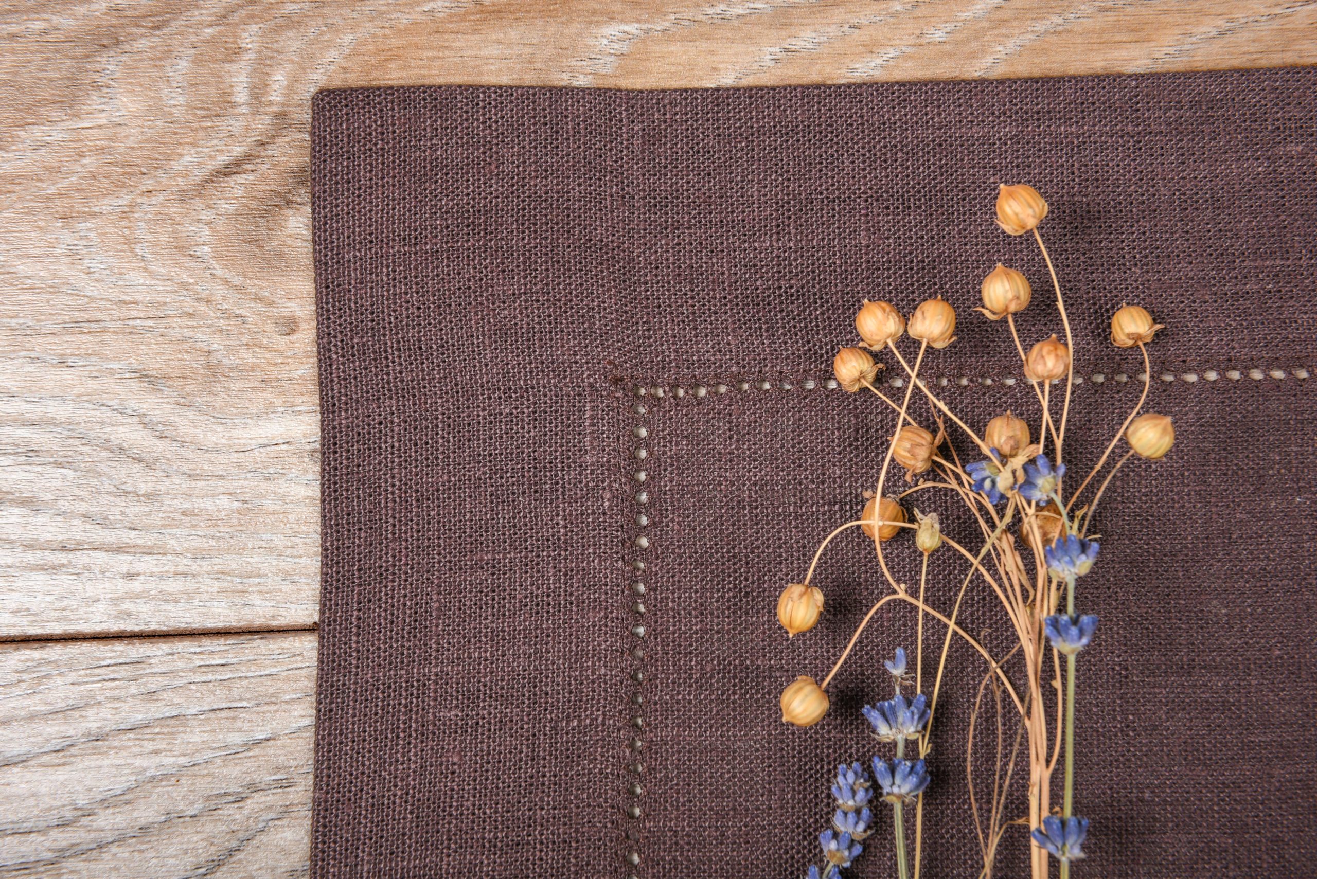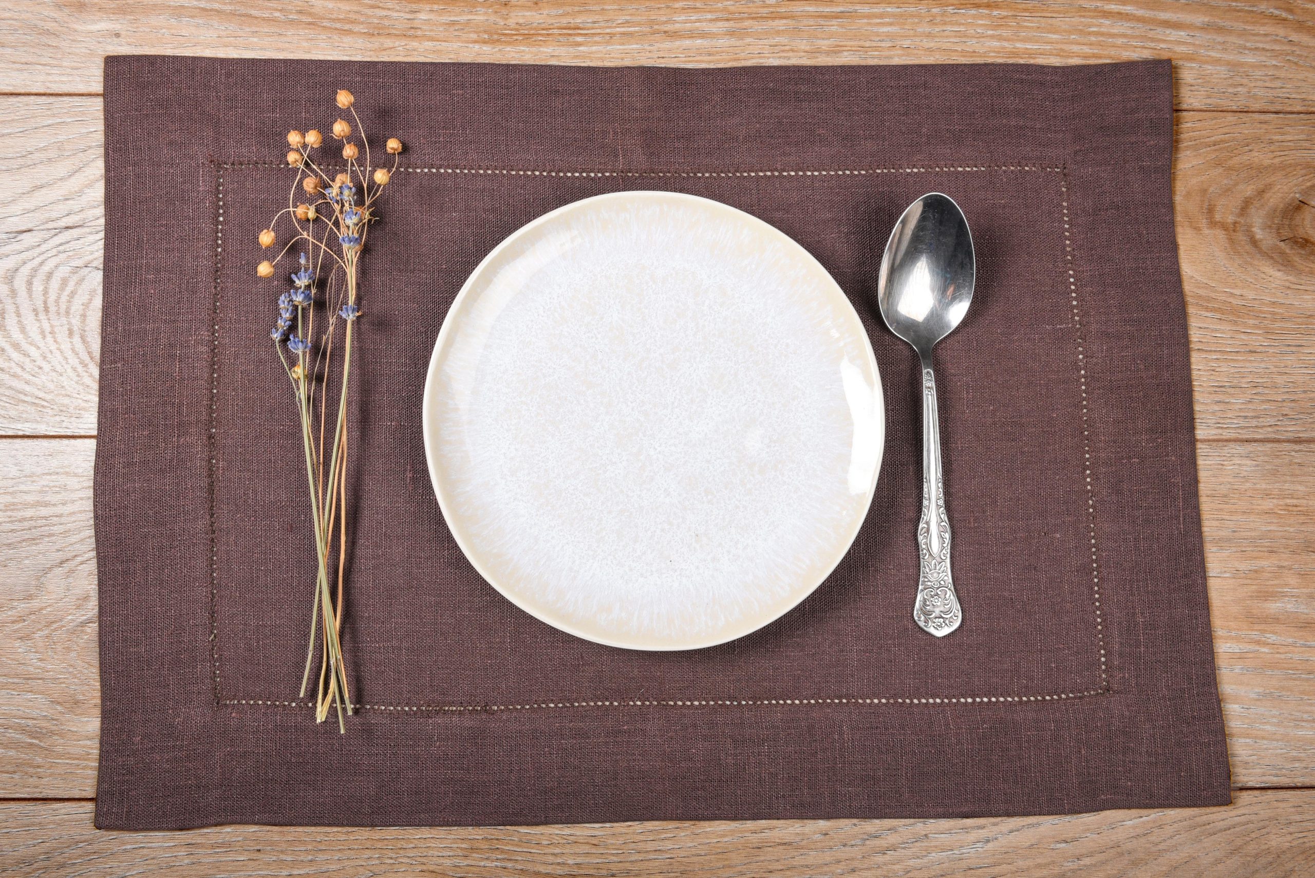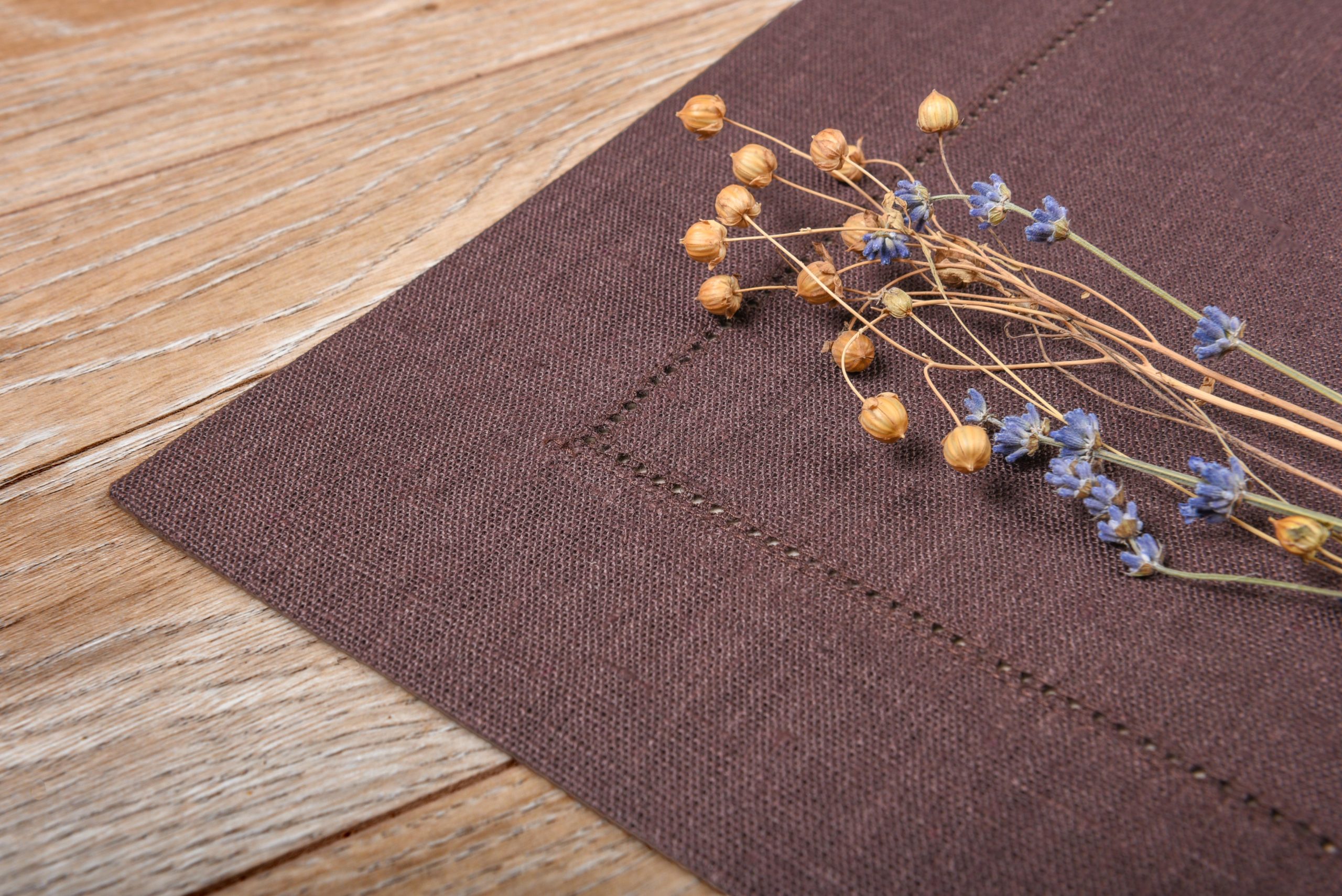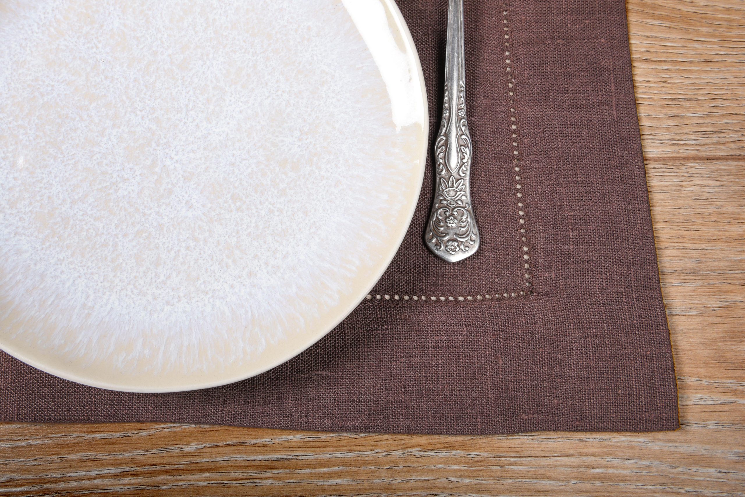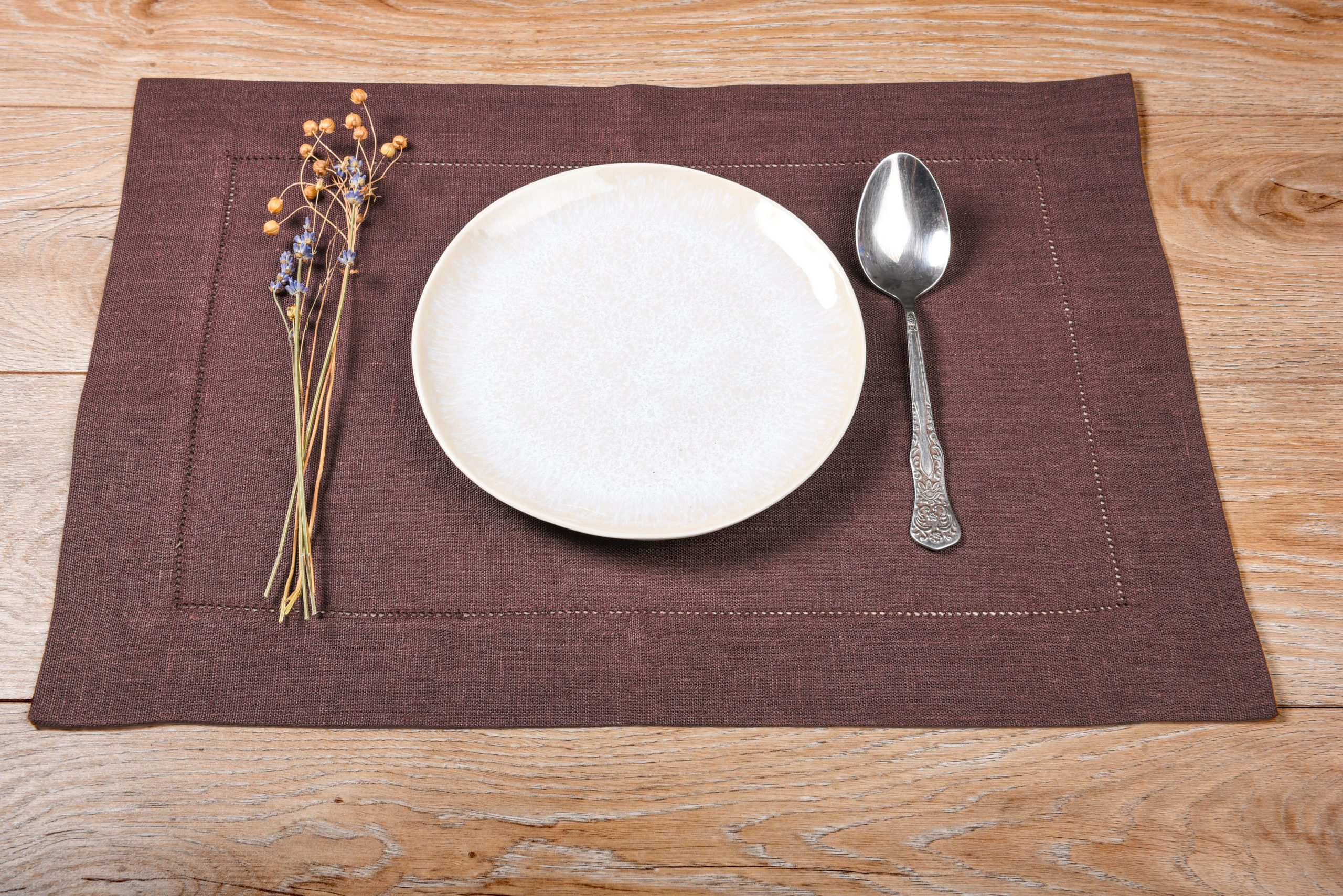 - Chocolate brown linen placemats made from 100% natural flax fibers.